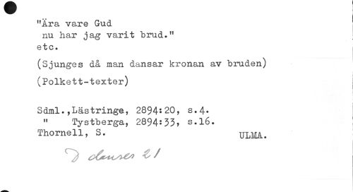 //// ^ / //// i //// !tAra vare Gud //// nu har jag varit brud." etc. //// (Sjunges då man dansar kronan av bruden) //// (Polkett-texter) j //// 1 //// i //// Sdml.,Lästringe, 2894:20, s.4. //// " Tystberga, 2894:33, s.l6. Thornell, S. ULMA. //// j ////