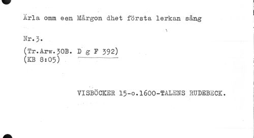 //// - ! Arla omm een Mår gon cl het första lerkan sång //// ¦ //// i //// Nr. J. //// (Tr.Arw.30B. D g F 392) //// (kb 8:05) //// / //// VISBÖCKBR I5-0.I6OO-TALENS RUDEBECK. 1 //// j //// I //// ' fl ////