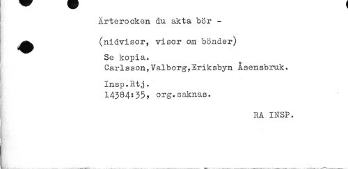 //// Ärterocken du akta bör - //// ^^ (nidvisor, visor om bönder) //// Se kopia. //// Carlsson,Valborg,Eriksbyn Åsensbruk. Insp.Rtj. //// 14384*359 org.saknas. //// RA INSP. ////