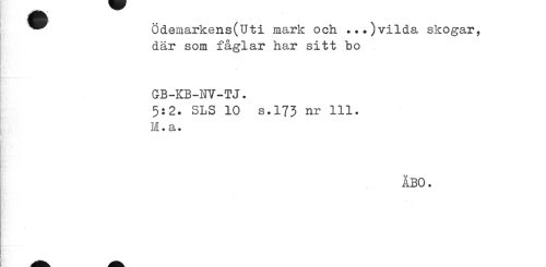 //// ^^ ödemarkens(Uti mark och ...)vilda skogar, //// där som fåglar har sitt bo //// GB-KB-FV-TJ. //// 5:2. SLS 10 s.173 nr 111. M.a. //// ÄBO. ////