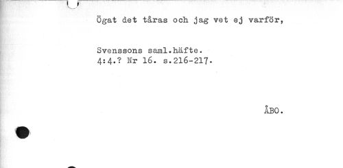 //// Ögat det tåras och jag vet ej varför, Svenssons saml.häfte. //// 4:4.? Nr lé. s.216-217• //// åbo. ////