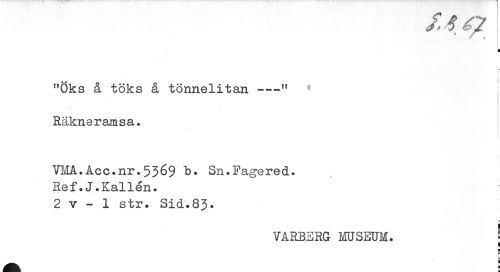 //// f* $ //// * t //// i //// "Öks å töks å tönnelitan « //// » //// Räkneramsa. //// VMA.Acc.nr.5369 b. Sn.Fagered. //// Hef.J.Kallen. t //// 2 v - 1 str. Sid.83. //// VARBERG MUSEUM. ! //// I //// i //// ^^ i é m ////