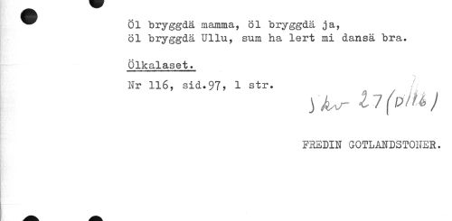 //// ^^ Öl bryggda mamma, öl bryggdä ja, //// öl bryggdä Ullu, sum ha lert mi dansa bra. //// Ölkalaset. //// Nr 116, sid.97? 1 str. //// )'k«r 17 (P/U J //// PREDIK G0TLÅHDST01IER. ////