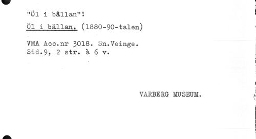 //// I //// "Öl i bållan"1 ! //// Öl i bällan, (1880-90-talen) //// VMA Åcc.nr 5018. Sn.Veinge. I //// Sid.9> 2 str. å 6 v. //// P \ //// r //// 1 //// I » //// I //// VARBERG MUSEUM. i //// = ////