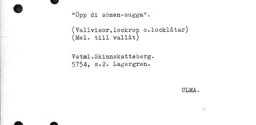 //// lfÖpp di sömen-sugga". //// (Vallvisor,lockrop o.locklåtar) (Mel. till vallåt) //// Vstml.Skinnskatteberg. //// 5754* s.2. Lagergren. //// ULMA. ////