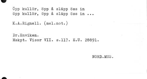 //// Öpp kullor, öpp å släpp öss in öpp kullor, öpp å släpp öss in . •. //// K.A.Rignell. (mel.not.) Dr.Enviken. //// Mskpt. Visor VII. s.117. E.U. 28891. //// NORD.MUS. //// I ////