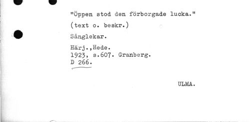 //// "Öppen stod den förborgade lucka." (text o. beskr.) Q) Sånglekar. //// Härj.,Hede. //// 1923, s.607. Granberg. D 266. //// ULMA. ////
