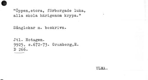 //// "Öppen,stora, förborgade luka, alla skola härigenom krypa." //// Sånglekar m. beskrivn. //// Jtl. Hotagen. //// 9925, s.672-73- Granberg,E. D 266. //// ULMA. ////