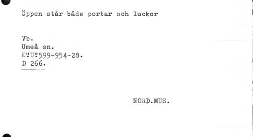 //// — //// Öppen står både portar och luckor ' //// ¦ //// Vb. //// Umeå sn. EVUV599-954-28. //// D 266. //// —-- //// i | //// l « //// NORD.MUS. ////