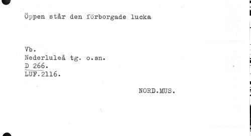 //// o I //// Öppen står den förborgade lucka //// ¦ //// . //// Vb. - //// Nederluleå tg. o.sn. t //// D 266. LUF.2116. //// i //// NORD.MUS. i //// ¦ //// •I //// I ¦ ////