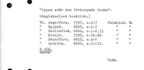 //// "Öppen står den förborgade lucka". Sånglekar(med beskrivn.) //// Tb. Degerfors, 7397, s.6-7 Palmblad, W. //// " Bygdeå, 8665, s.6-7 fl 11 //// " Skellefteå, 8664, s.1-2,15 " " //// " Norsjö, 7395, s.55-56 " " //// " Degerfors, 8653, s.4-6 " " //// " Nysätra, 8660, s.10-11. " " //// D 266. //// ULMA. ////