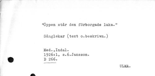 //// "Öppen står den förborgade luka.n Sånglekar (text o.beskrivn.) //// Med.,Indal. //// 1926:1, s.6.Jansson. //// ^ ^ i» ¦¦ //// ulm. ////
