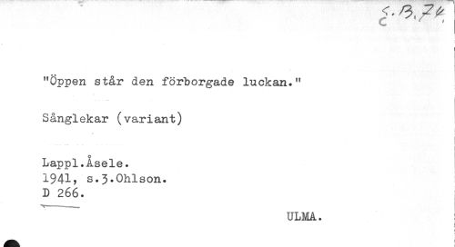 //// "öppen står den förborgade luckan." Sånglekar (variant) //// i //// Lappl.Åsele. //// 1941, s.3.Ohlson. i //// D 266. //// ULMå. //// I ! //// I ////