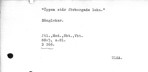 //// ^K.-''''' //// "Öppen står förborgade luka." Sånglekar. //// Jtl. ,Med. ,Nbt. ,Vbt. 88:5, s.81. D 266. //// ^ ULMÅ. ////