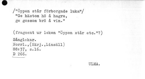 //// /"Öppen står förborgade luka"/ "Ge hästom hö å hagre, ge gossom bro å vin." //// (fragment ur leken "Öppen står etc."?) Sånglekar. //// Norrl.,(Härj.,Linsäll) 88:J7, s.16. //// D 266. //// ... //// ULM. ////