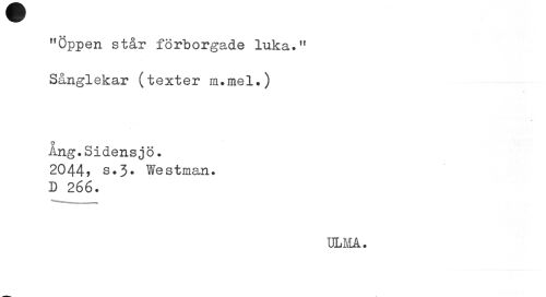 //// "Öppen står förborgade luka.11 Sånglekar (texter ni.mel.) //// Äng.Sidensjö. //// 2044, s.3. Westman. D 266. //// ULM. ////