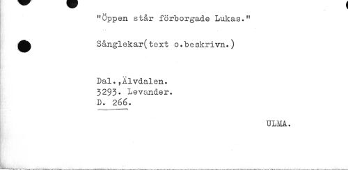//// - t //// "öppen står förborgade Lukas.11 Sånglekar(text o.beskrivn.) //// Dal.,Älvdalen. 3293* Levander. D. 266. //// UL MÅ. //// MÉllMÉ^ -„•... ,. .. '«•••' ..._ _ ...¦¦ . ifU...K ... .;„.„,,. ////