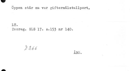 //// Öppen står nu var giftermålstullport, //// LT. //// 2:oreg. SLS 17. s.153 nr 140. //// i Ut //// ÅBO. //// « ////