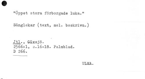 //// "Öppet stora förborgade luka." //// Sånglekar (text, mel. beskrivn.) //// % //// Jtl., Gåxsjö. //// 2566:1, s.16-18. Palmblad. D 266. //// ... ¦¦¦¦¦! I 1 I II //// ULM. ////