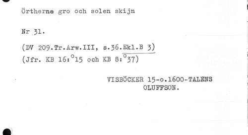 //// Örtherne gro och solen skijn Nr 31. //// i //// (DV 209.Tr.Arw.III, s.36.Ekl.B 3) //// (Jfr. KB 16:°15 och KB 8:°37) //// VISBÖCKER 15-O.1600-TALENS //// OLUPFSON. //// 1 //// I ¦ ////