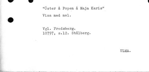//// "öster å Popen å Maja Karis" //// t //// ^^ Visa med mel. //// Vgl. Fredsberg. 10797, s.12. Stålberg. //// K //// ULMA. //// i___ . ___ ¦ . ////