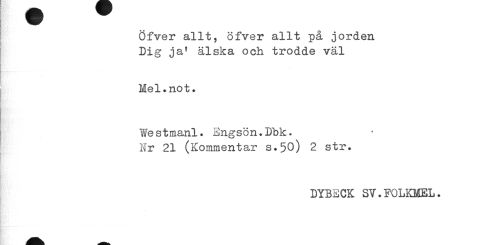 //// Öfver allt, öfver allt på jorden Dig ja! älska och trodde väl //// Mel.not. //// Westmani. Engsön.Dbk. //// Nr 21 (Kommentar s.50) 2 str. //// DYBECK ST.FQLKMEL. ////