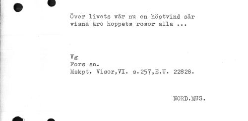 //// Över livets vår nu en höstvind sår visna äro hoppets rosor alla ... //// « //// Yg //// Fors sn. //// Mskpt. Visor,71. s.257,E.U. 22828. //// HORD.MUS. //// ^ ¦ i ^ ////