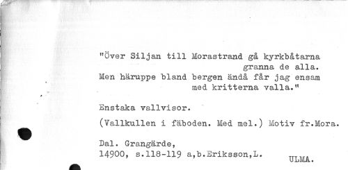 //// "Över Siljan till Morastrand gå kyrkbåtarna //// granna de alla. Men häruppe bland bergen ändå får jag ensam //// med kritterna valla." //// Enstaka vallvisor. //// (Vallkullen i fäboden. Med mel.) Motiv fr.Mora. Dal. Grangärde, //// 14900, s. 118-119 a,b.Eriksson,L. xjLMA ////