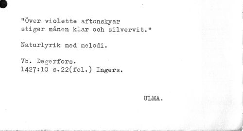 //// "Över violette aftonskyar stiger månen klar och silvervit." //// Naturlyrik med melodi. //// Vb. Degerfors. //// 1427:10 s.22(fol.) Ingers. //// i //// ULMA. //// ? ////