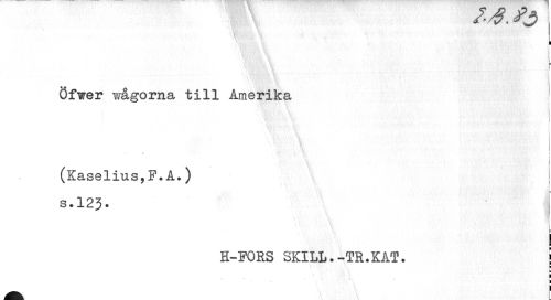 //// ¦ //// r //// Öfwer wågorna till Amerika //// * i (Kaselius,F. A.) s.123. //// i //// H-FORS SKILL.-TR.KAT. j //// U ////