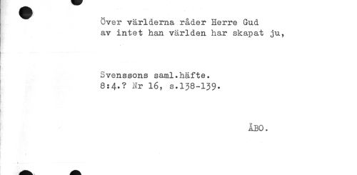 //// mk //// Över världerna råder Herre Gud //// av intet han världen har skapat ju, //// # //// Svenssons saml.häfte. //// 8:4.? Er 16, s.138-139. //// ÅBO. ////