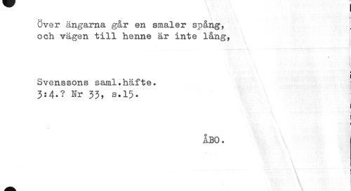 //// \ //// V 1 //// \ l- //// Över ängarna går en småler spång, ! //// och vägen till henne är inte lång, //// < //// Svenssons saml.häfte? 3:4-? Nr 33, s.l5. //// åbo. //// j ////