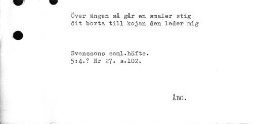 //// Över ängen så går en småler stig dit borta till kojan den leder mig //// 'mm B //// Svenssons saml.häfte. //// 5:4.? Nr 27. s.102. //// ÅBO. ////