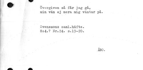 //// ^^ Övergiven så får jag gå, //// min vän ej mera mig väntar på. //// i * //// 4 % //// 4 //// •I //// « //// fr //// ¦ii i r 11 ¦ ¦-•» * * ' ' 4 ' //// t //// 4 //// Svenssons saml.häfte. 8:4.? Nr.24. s.19-20. //// f \ , I'-*» //// t //// * rfv * ' //// •1 1 -» //// 1 //// » » //// ? //// *» i, . j //// % //// ÅBO. //// v //// ¦ggp / //// k //// . 1 ////