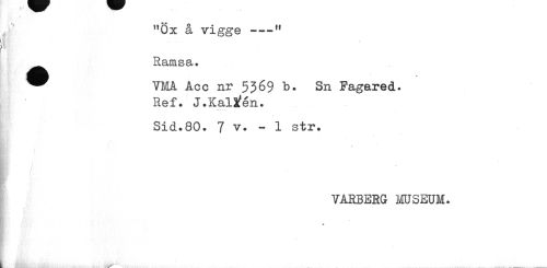 //// /< > //// nÖx å vigge---M //// Ramsa. //// ^^ VMA Acc nr 5369 "b. Sn Fagared. //// Ref. J.Kalken. //// Sid.80. 7 v. - 1 str. //// r ' //// VAKBERQ MUSEUM. ////
