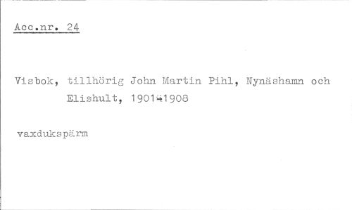 //// Aec.nr. 24 //// Visbok, -tillhörig John Martin Pihl, Nynäshamn och Elishult, 190141908 //// vaxdukspärm ////