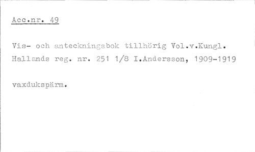 //// Aec.nr. 49 //// Vis- och anteckningsbok tillhörig Vol.v.Kungl. Hallands reg. nr. 251 1/8 I.Andersson, 1909-1919 //// vaxdukspärm. ////