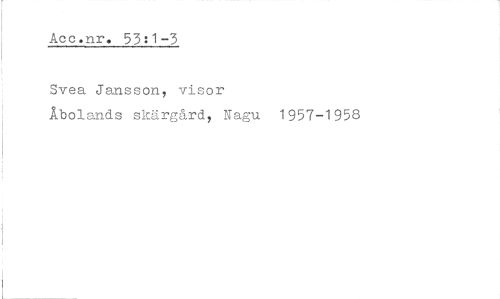 //// Acc.nr, 53i 1—3 //// Svea Jansson, visor //// Åbolands skärgård, Kagu 1957-1953 ////