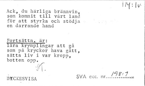 //// Ack, du härliga brännvin, som kommit till vart land för att styrka och stödja en darrande hand //// Fortsättn. är: lära krymplingar att gå som på kryckor hava gått, sätta liv i var kropp, botten opp. //// fl. //// ÖBXKESVISA SVA CCC' ... ////