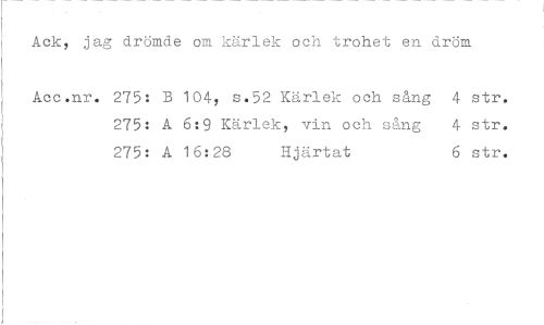 //// Ack, .jag drömde om kärlek och trohet en dröm //// Acc.nr. 275: 3 104, s.52 Kärlek och sång 4 str. //// 275: A 6:9 Kärlek, vin och sång 4 str. 275: A 16:28 Hjärtat 6 str. ////