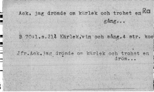 //// Ack, jag drömde om karlek och trohet en ^ //// gång... | //// B TO:l,s.2l4 Kär-leK,V in och sång. 4 str. kom //// 1- //// «» //// Jfr.Ack,iag drömde om kärlek och trohet en //// dröm... i //// ! ////
