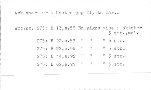 //// Ack snart ur tjänsten jag flytta får.. //// Acc.nr. 275: B 13» s.58 En pigas visa i oktober //// 5 str.,mel. //// 275: B 22,s.53 " " " 5 str. //// 275: B 22,s.98 " " " 5 str. //// 275: B 44,s.92 " " " 5 str. //// 275: B 62,s.21 " " " 5 str. ////