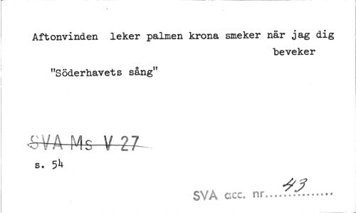 //// Aftonvinden leker palmen krona smeker när jag dig //// "beveker //// "Söderhavets sång" //// SVA Ms V IT //// s. 5b //// SVA ccc. nr... ... ////