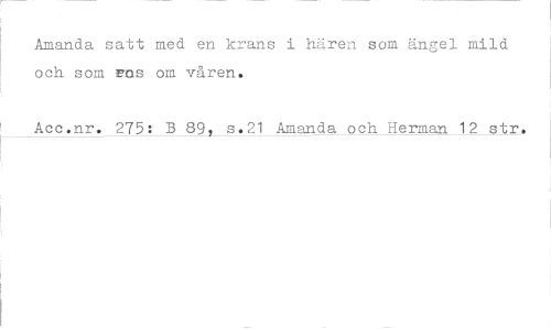 //// Amanda satt med en krans i hären som ängel mild och som ras om våren. //// Acc.nr. 275: B 89, s.21 Amanda och Herman 12 str. ////