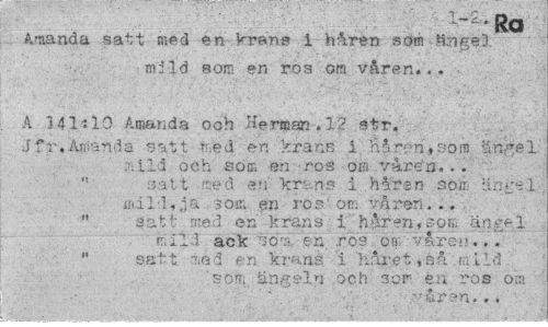 //// Amanda satt med en krans i håren som ftngel mild som en ros om våren... //// A 341:10 Amanda ooh Herman.12 str. Jfr.Amanda satt fred en krans i håren*som ängel . xili och aoc en ros om våren... //// " satt me.d en' krans i håren som än£ei //// i>«i 1 ¦!. ,1 a 3om en ros' om vårert... " satt med en krans i håren,sor.. ängf-1 //// mild ack "öra en ros ow, våren-... " satt rtiäd en krans i håret,så mild //// som ängeln och 3or en ros om //// » — //// - ////