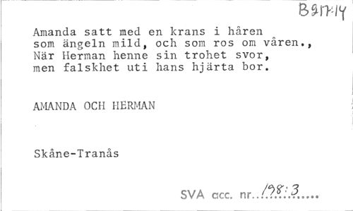 //// Amanda satt med en krans i håren som ängeln mild, och som ros om våren., När Herman henne sin trohet svor, men falskhet uti hans hjärta bor. //// AMANDA OCH HERMAN Skåne-Tranås //// SVA gcc. nr../.W.?... ////