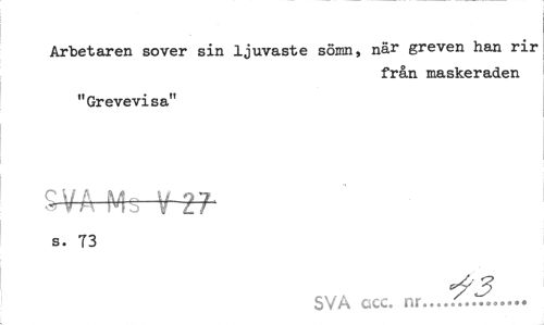 //// Arbetaren sover sin ljuvaste sömn, när greven han rir //// från maskeraden //// "Grevevisa" //// SVA Ms V 27 //// s. 73 //// SVA ccc. nr...<...*>•• ////