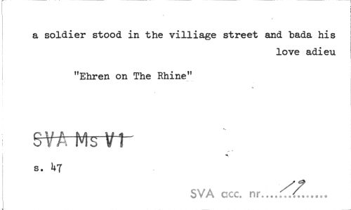 //// a soldier stood in the villiage street and bada his //// love adieu //// "Ehren on The Rhine" //// SV/- Ms VI //// s. UT //// SVA cscc. ////