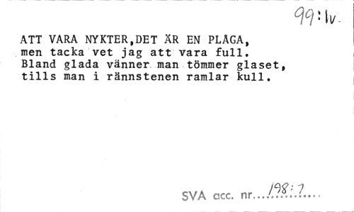 //// ATT VARA NYKTER,DET ÄR EN PLÄGA, men tacka vet jag att vara full. Bland glada vänner man tömmer glaset, tills man i rännstenen ramlar kull. //// SVA acc. nr.../.?.?:.?... ////