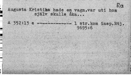 //// Augusta Kristilia hade en vagn,var uti hon själv skulle åka... ¦ " ¦ . //// I a 352:13 e---1 str.kom insp.Rtj. //// 9695:6 //// - //// : ' j ////